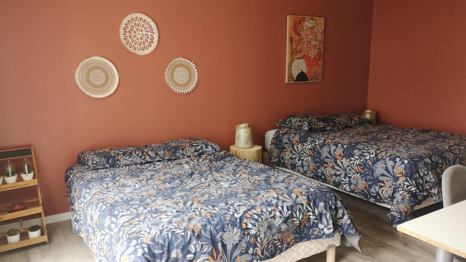 Réservez votre chambre Terra Cota de 26 m², équipée de deux lits doubles et pouvant accueillir jusqu’à 4 personnes. Elle est disponible uniquement en complément du studio principal, pour les groupes de 3 à 6 personnes.